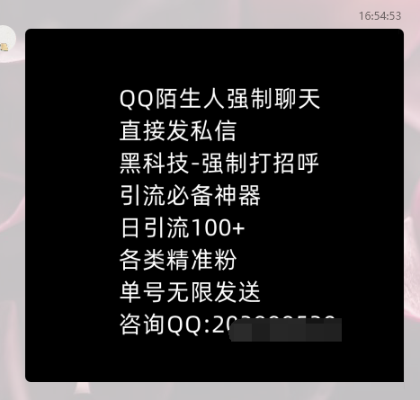 很多人看到这种文案就被吸引了,W-C!这么NB?,赶紧想要加广告上的QQ咨询引流神器。